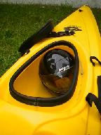 la persona è seduta su una specie di chiatta almeno 10 cm più larga con il busto completamente libero e preme con i piedi e il poggiaschiena per tenersi solidale alla canoa solo in senso longitudinale.
